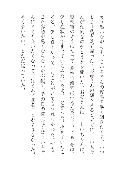 ぼくは、今もじいちゃんとよく話をします。以前より、話す時間が長くなったり、宿題もそこでしたり、おやつも一緒に食べたりと、じいちゃんのそばにいる時間が長くなりました。夏の終わりには一緒にさつまいもの収穫もできました。じいちゃんは、よくぼくに、「浩裕がいるから、元気でいられるよ。」と言います。ぼくのほうこそじいちゃんのおかげで元気でいられると思っています。